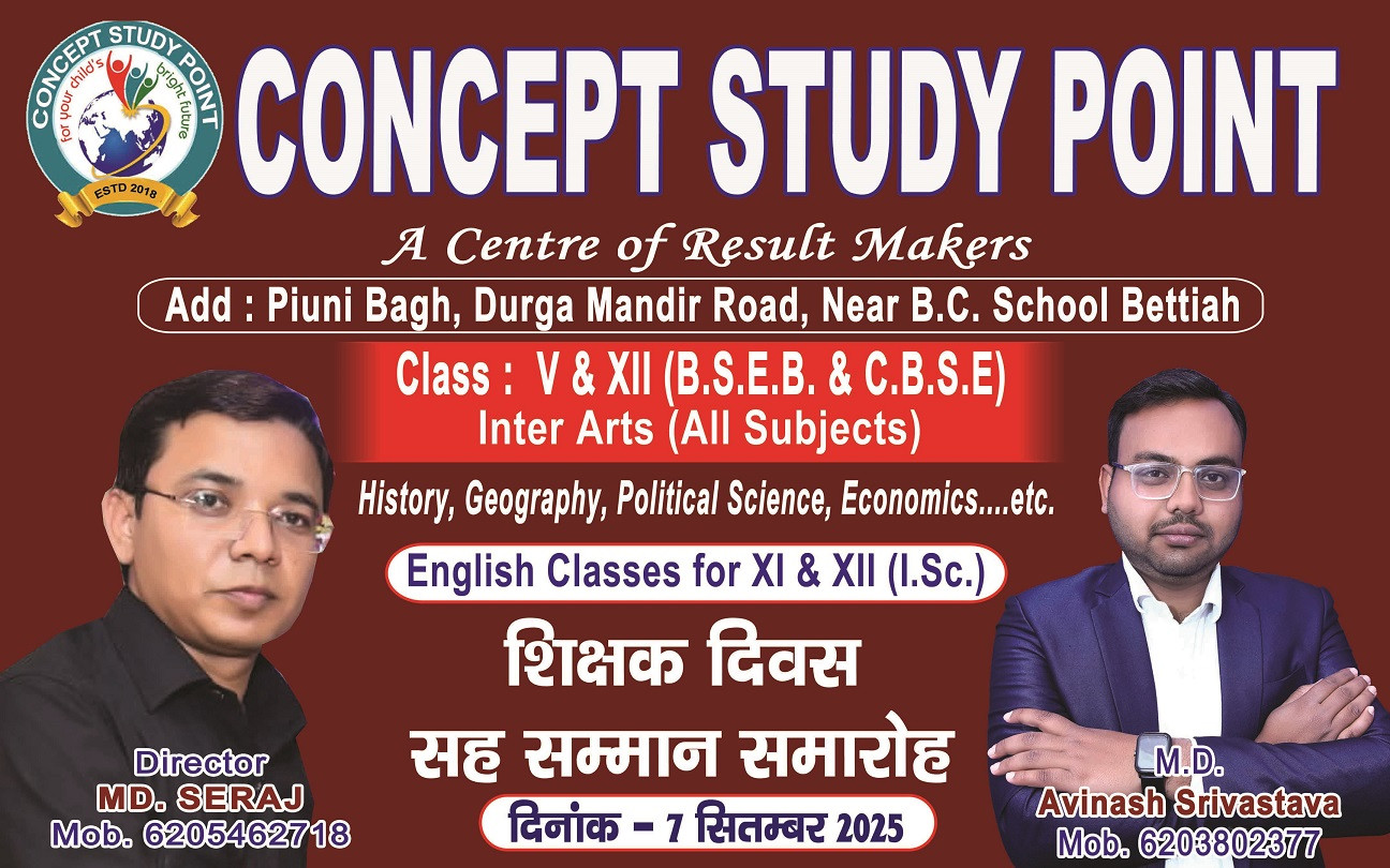 कॉन्सेप्ट स्टडी प्वाइंट जो पीयूनिबाग,बी सी स्कूल बेतिया के पास संचालित होता है,इसके निर्देशक,मोहम्मद सिराज तथा मैनेजिंग डायरेक्टर,अविनाश श्रीवास्तव की संयुक्त रूप से इसको संचालित किया जाता है।इस कोचिंग संस्था में,वर्ग पांच से लेकर 10 + 2 तक के छात्र-छात्राओं को विभिन्न विषयों में विधिवत रूप से शिक्षा दी जाती है। इस संस्था के द्वारा शिक्षक दिवस सह सम्मान समारोह काआयोजन बड़ी धूमधाम से सुसज्जित सभागार में किया गया,जिसमें विभिन्न प्रकार के संस्कृत कार्यक्रम,ड्रामा,विभिन्न विषयों परआधारित नाटक,नृत्य संगीत,भाषण प्रतियोगिता भी