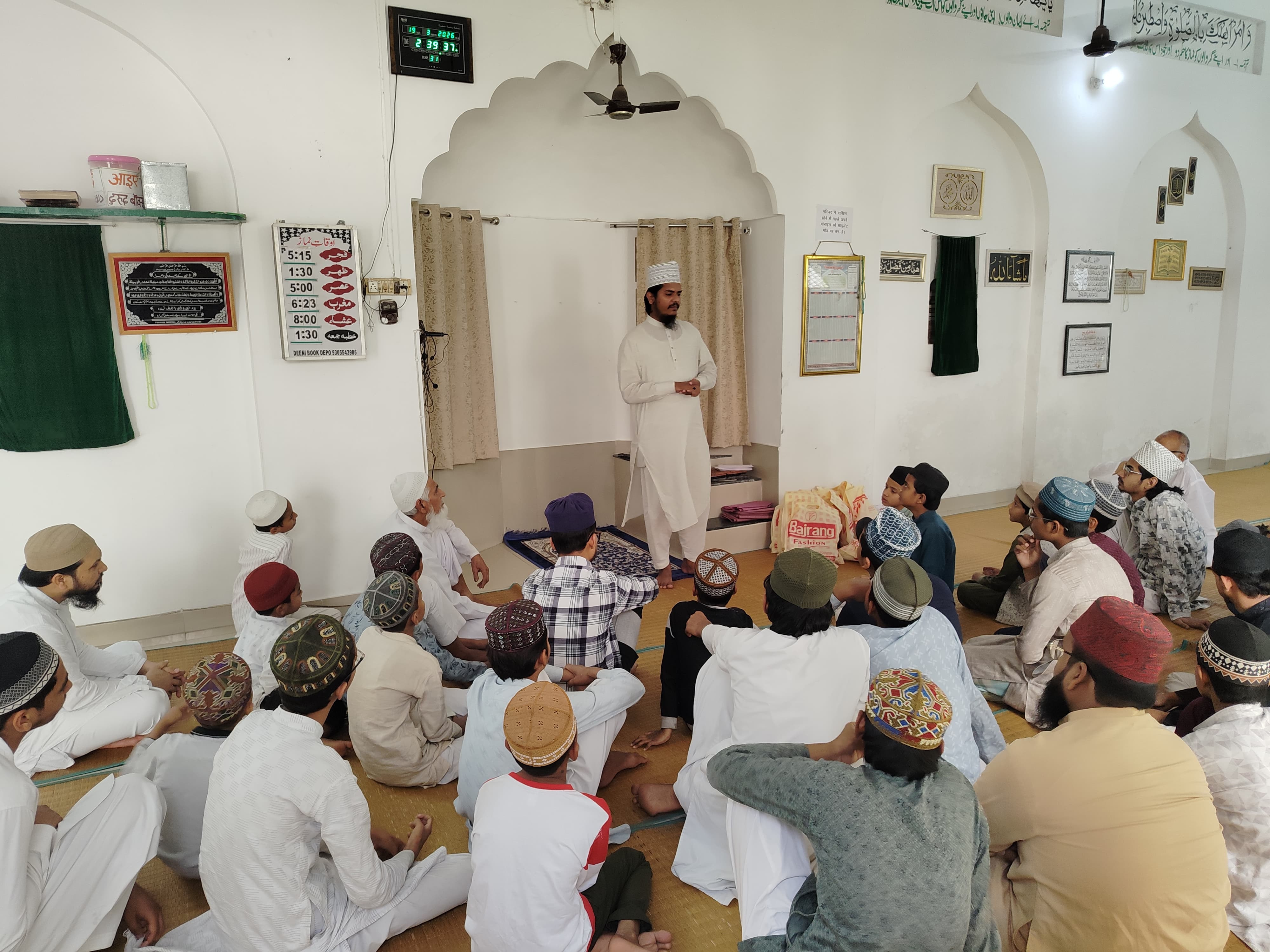 मस्जिद के इमाम हाफिज रहमत अली निजामी ने ईद के दिन के आदाब बताए। मिस्वाक करना। गुस्ल करना। साफ सुथरा लिबास पहनना। अगर नया मयस्सर हो तो नया कपड़ा पहनना। खुशबू लगाना। नमाजे ईद से पहले सदका-ए-फित्र अदा करना। अगर मुमकिन हो तो पैदल ईदगाह जाना। एक रास्ते से जाना दूसरे से वापिस आना। ईदगाह जाने से पहले ताक अदद खजूरें, छुआरे या कोई और मीठी चीज जो मयस्सर हो खाना। निगाह नीचे किए बाअदब और पुरवकार तरीके से ईदगाह जाना। ईद-उल-फित्र में ईदगाह तकबीरे तशरीक आहिस्ता पढ़ते हुए जाना। ईद की नमाज खुले मैदान या ईदगाह में पढ़ना। ईद के दिन अपने आस पड़ोस के गुरबा मसाकीन का खुसूसी ख्याल रखना। जरूरतमंदों की मदद करना। नमाजे पंजगाना की खास तौर पर पाबंदी करना। और तमाम तरह के गुनाहों से बचना और नेकी के कामों में ये दिन गुजारना।