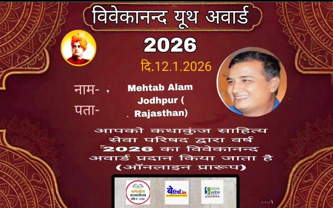 राजस्थान के साहित्यिक एवं सामाजिक परिदृश्य में एक महत्वपूर्ण पहल के तहत कथाकुंज साहित्य सेवा परिषद ने मेहताब आलम को विवेकानंद यूथ अवार्ड से नवाजा गया है है। मेहताब आलम जोधपुर जिले से संबंधित हैं और साहित्य, संस्कृति एवं सामाजिक सेवा के क्षेत्र में निरंतर सक्रिय रहे हैं।